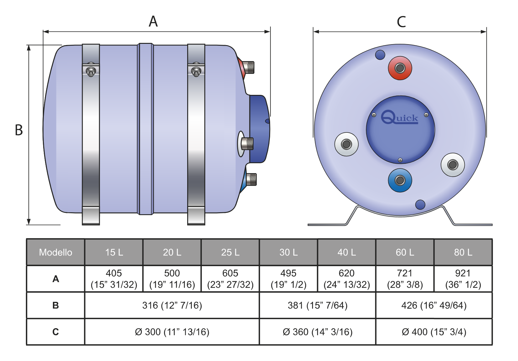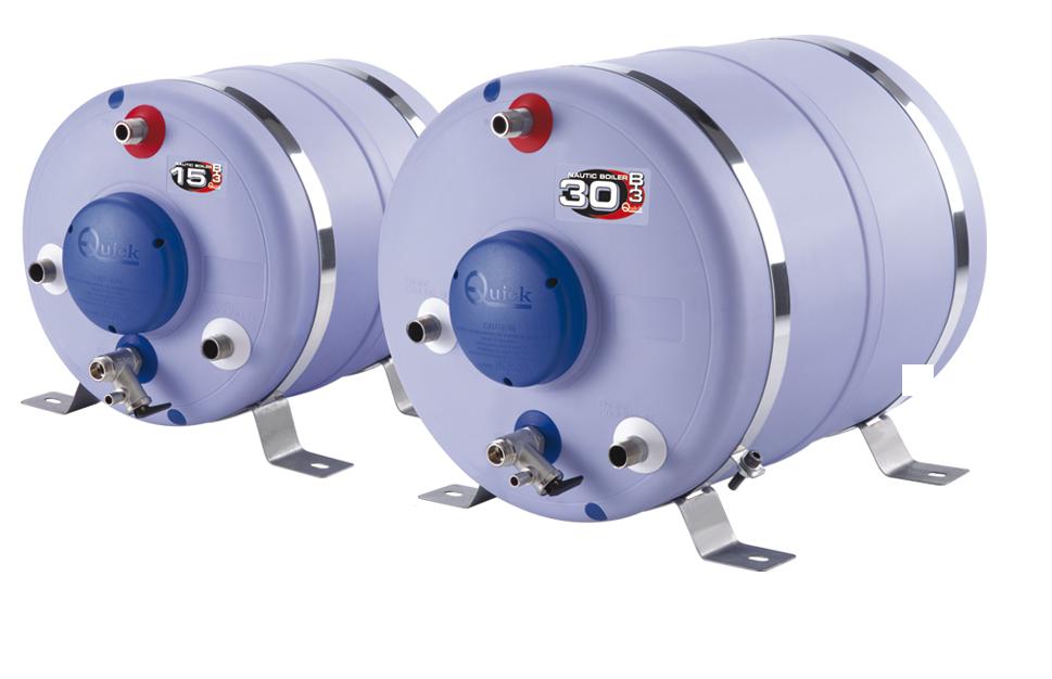 Bojler jachtowy renomowanej marki Quick. Zbiornik wykonany ze stali nierdzewnej o grubości 1,5 mm, mocowanie z tworzywa odpornego na wstrząsy i środowisko morskie. Maksymalne ciśnienie robocze 8 bar, napięcie zasilania 230 V, średnica króćców 1/2", moc grzałki elektrycznej 500 W. Średnica zbiornika 360 mm, długość 495 mm, waga 10,5 kg. Bojler posiada zawór bezpieczeństwa i wymiennik ciepła umożliwiający ogrzewanie wody cieczą chłodzącą silnik.