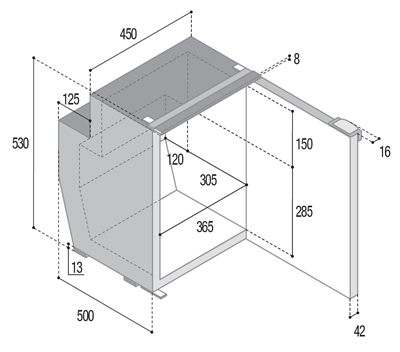 Kompresorowa lodówka na jacht o pojemności 62 l, pojemność zamrażalnika 4,5 l. Wymiary 450 x 530h x 517 mm, waga 18 kg. Wersja z wewnętrznym agregatem. Lodówka jest wyposażona w system wentylacji Airlock i oświetlenie LED. Kompresor marki Secop (wcześniej Danfoss). Ramka do zabudowy zlicowanej występuje akcesoryjnie.