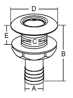 Przejście burtowe z końcówką na wąż. Wymiary ze schematu: A - 25 mm, B - 64 mm, C - ¾", D - 48 mm, E - 37 mm.